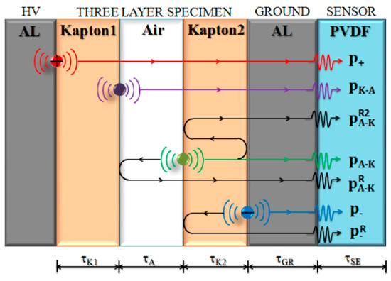 The above described principles are the basis for using the PEA method on flat specimens. The measurement setup shown in Figure 5 can be used for single or multiple dielectric layers [2,19]. In the case of space charge measurements on multilayer flat specimens, particular attention must be paid to take into account the different permittivities and acoustic properties of the layers [21,22]. The pressure distribution at the piezoelectric membrane depends on the acoustic impedances (Z) of the crossed materials, defined as the product between the acoustic velocity and the mass density. When the acoustic wave passes from a material with acoustic impedance Z1 to a material with acoustic impedance Z2, the ratio of the transmitted pressure amplitude T can be calculated as follows: