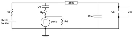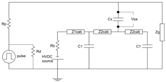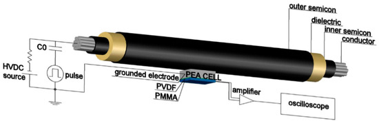 Despite the growing demand of extruded HVDC cables, and the recent publication of an international standard [5], there is still no universally accepted protocol for the execution of PEA measurements [13]. As mentioned above and experimented by many researchers, several parameters have an important role in the quality of PEA measurements. In particular, the cable length, the cell arrangement, the equivalent capacitances, and impedances of the measurement setup (see Figure 9, Figure 10, Figure 11, Figure 12, Figure 13 and Figure 14) should be optimized for a certain cable [45]. For example, a special apparatus with low pass filters at the oscilloscope input, high voltage pulse generator and an appropriate thickness of the PEA cell electrode should be implemented for measurements on thick cable insulations [46]. Indeed, the compatibility of a commercial PEA apparatus should be carefully evaluated on the basis of the characteristics of the specific cable on which space charge measurements should be done. In addition, a physical model of the measurement region of the cable and of the PEA cell should be implemented in order to correctly evaluate the superposition of reflected signals on the direct ones that reach the piezoelectric film [47].