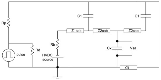 The use of this method requires the insulation of the PEA cell and of the amplifier from the ground. On the measurement region sides, beyond a stretch of cable with the outer semicon layer exposed, the remaining external surface is grounded by the means of a conductive tape. With reference to Figure 13 and Figure 14, the impedance Zg is, in this case, mainly resistive. Since the pulsed voltage is directly applied to the measurement region, this setup is less influenced by reflection and attenuation of the HV signal than the other methods described above [25]. This makes this method applicable for long, full size cables as proposed by N. Hozumi et al. in 1998 [31]. In this configuration, the PVC jacket and the screen are removed near the measurement point, positioned at the center of the exposed semicon region. The pulsed voltage is applied between the PEA cell electrode and the wire screen of the cable. The amplitude of the pulsed voltage is proportional to the ratio between the impedance of the capacitance at the measurement point and the characteristic impedance of the cable. This makes this method also applicable to thick insulations because the amplitude of the pressure waves generated at the farthest electrode is proportional to the amplitude of the voltage pulses.