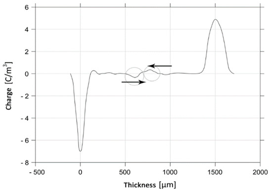 Electric stress value. As mentioned above, a low applied electric field to the sample leads to the accumulation of charges at electrodes but not into the bulk of the dielectric. The PEA output results obtained at low electric field are used for calibration and as reference for the deconvolution process. At high electric field, as described above, several phenomena of injection, forming, and accumulation of space charge could occur. A phenomenon of formation of hetero charges near the electrodes has been recently observed at low electric field suddenly after the application of a DC source [38,39]. In Figure 18 the behavior of a “fast charge pulse” is graphically illustrated. The charge carriers’ mobility observed in this phenomenon is 4–5 orders of magnitude higher than the one occurring during conventional conduction processes [40]. The occurring of fast charge pulses at design values of applied electric field can lead to the aging of the insulation material also if no overvoltage transient happens during the cable lifetime. In order to observe this phenomenon with a sufficient spatial resolution, a small width of voltage pulses (<10 ns) is required to carry out the PEA measurements [41].