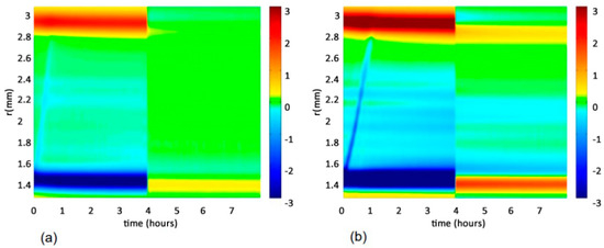 Example of migration of negative charges at −30 kV (a) and −55 kW (b) during charging (left side) and discharging (right side)—figure reproduced from [33].