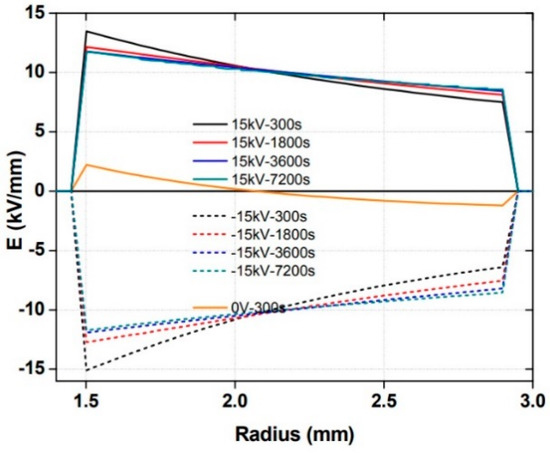 The profiles shown in Figure 3 can be found through a semi-empirical expression useful to calculate the electric field across the dielectric EDC of an HVDC cable under thermal and electrical stress, as is reported in Equation (2) [1]: