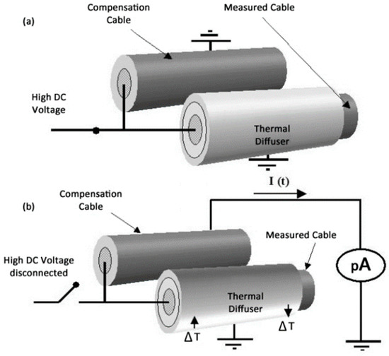 In addition to the PEA, the Thermal Step Method (TSM) is a recognized method for space charge measurements on full sized cables also mentioned by the standard IEEE Std 1732TM-2017. In Figure 22 a schematic of the TSM method as described by the aforementioned standard is shown. This method was invented by Tourielle in 1987 [48] and it relies on the application of a thermal step across the insulation in order to generate a temporary displacement of the charges within. This influences the amount of charges at the interfaces generating a current with a typical order of magnitude of pA if the dielectric is short-circuited. The generated current signal is then amplified, deconvoluted, and calibrated in order to obtain the relation between the charge density and the radial coordinate. The thermal step can be generated heating the conductor or cooling the outer surface. In the first case, the short-circuited cable works as the secondary of a transformer and it is crossed by a current of several kA. Alternatively, the cooling of the outer surface is carried out by means of a cylindrical thermal diffuser crossed by a cold fluid and adjacent to the cable surface. While the inner heating method provides information about the whole cable, the outer cooling is used to get space charge measurements in a small portion of the sample (20–40 cm) [6]. The outer cooling method is the one recommended by the above cited standard.
