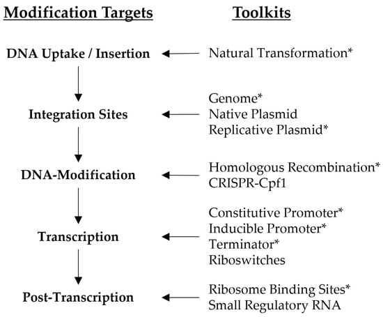 Overview of molecular toolkits and their modification targets in the cellular process of gene expression for Synechocystis sp. PCC6803. CRISPR (clustered regularly interspaced short palindromic repeats); *—Toolkits applied for ethanol production in Synechocystis sp. PCC6803 so far.