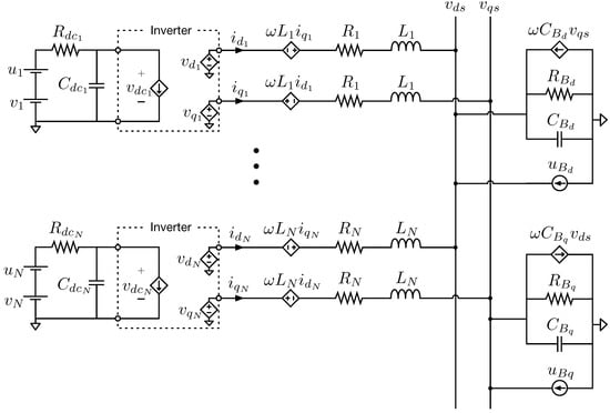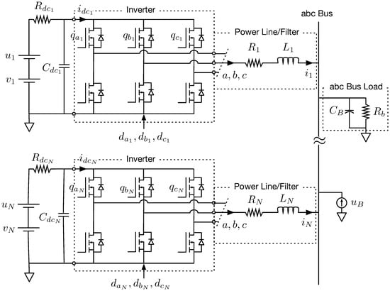 The ideal energy storage devices of the system () were used in [10,17] as control inputs to develop a feedback controller, utilizing Hamiltonian surface shaping and power flow control (HSSPFC) techniques, which ensures stability while satisfying time-varying bus loads [10,17,18]. The state variable model of [17], which was modified by [10] by the addition of , has been expanded to N inverters, where is the state vector, is the N stochastic source vector, and is the input vector [10,17]: