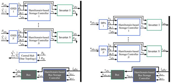 Conventional droop control is a common decentralized control method for islanded AC inverter microgrids, which will be used as a basis of comparison for the decentralized power apportionment approach presented in Section 5. While all three control methods are designed to maintain a specified bus voltage, droop control depends on the implementation of a virtual impedance to share the bus currents among the inverters, while both the DPA and OXD approaches are based on HSSPFC techniques which take advantage of distributed storage making it possible for the high penetration of stochastic renewable sources. The key differences among OXD, DPA, and the conventional droop control resides in the communication requirements to implement the control scheme. In the case of OXD and DPA, said communication differences affect the storage requirements to actuate the microgrid. These communication requirements are summarized in Table 1, where the jth inverter’s known quantities are: , , , , , , , , , , and . Figure 3 provides corresponding block diagrams for the OXD and DPA control methods.