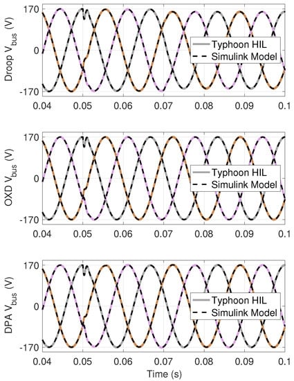 The results of the model verification tests are shown in Figure 4, where it can be seen that the MATLAB/Simulink models matched the Typhoon HIL 602 implemented microgrid. All three control methods successfully compensated for the bus load power increase. As expected, the OXD and DPA controlled microgrids were able to return the bus to following the source step change, whereas the droop controlled microgrid experienced a drop to .
