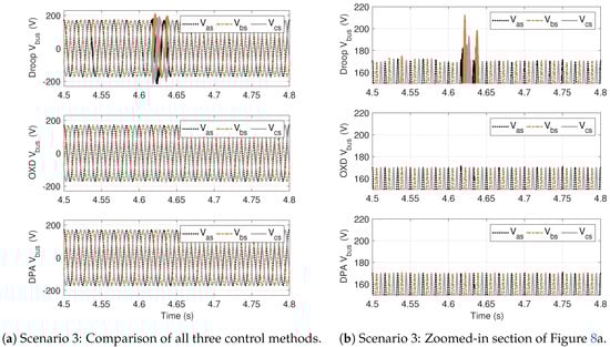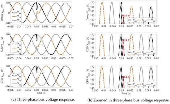 Scenario 1: (a) Three-phase bus voltage response to a bus load step change at s for all three control methods: droop, OXD, and DPA. (b) Zoomed-in response to a bus load step change at s, to more easily identify performance differences.