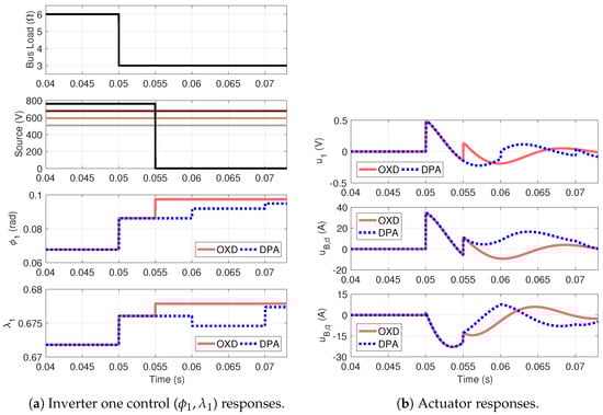 Scenario 2: OXD and DPA: (a) inverter one controls the () response and (b) controlled storage response to a bus load step at , followed by the largest inverter being eliminated from the microgrid at .