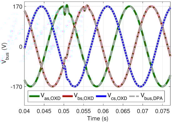 Scenario 2: OXD and DPA bus voltage response to the bus load step at s followed by the largest inverter being eliminated from the microgrid at s. OXD controlled bus voltage is shown in red, green, and blue, with the DPA controlled bus voltage overlayed in gray.