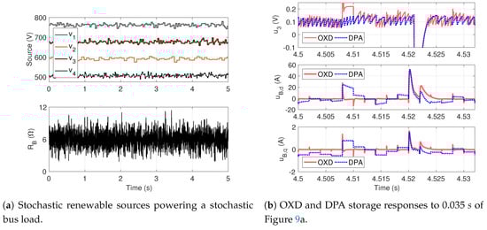 Scenario 3: (a) Stochastic renewable sources powering a stochastic bus load and (b) a small portion of the corresponding OXD and DPA storage responses. For clarity, only source storage was plotted.