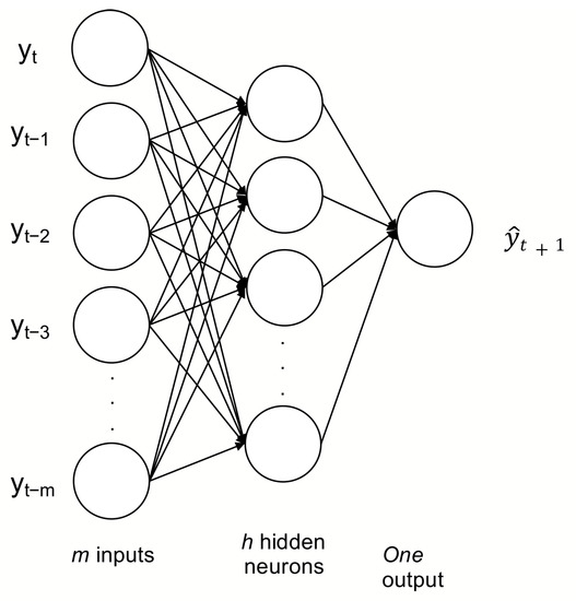 Figure 5. Artificial Neural Network (ANN) topology which starts with the input layer (m past observations), continues with the hidden layer (h hidden neurons), and ends with an output layer (a single output y ^ t + 1 ). For general Artificial Neural Network terminology, see [54].