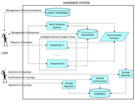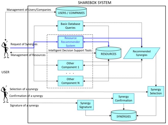 Currently, there are several modules implementing different approaches to calculate the suggested synergies. Some of these components, especially some input-out modelling techniques, could be very hard from a computational point of view, particularly when the resource database of the SHAREBOX platform will be highly populated. This seems to leave space for trying to improve the computational time spent to obtain the suggestion of the synergies for a given company. On the other hand, there is another important feature that can be improved: the quality of the recommended synergies, because an intelligent component could learn from the past synergies performed through the platform system. This way, each time that a synergy is finally completed, a new valuable experience and information can be learnt by this intelligent module, issuing at improving future recommendations, and also learning which synergies were not successful, aiming at not making the similar errors in the future. Currently, the SHAREBOX architecture can be outlined, as depicted in Figure 2.