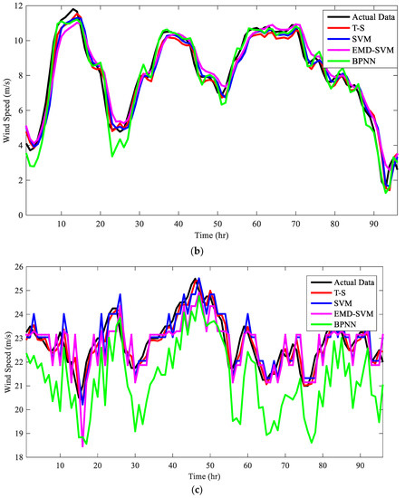 The forecasting results from the proposed model and other models were obtained as seen in Figure 5, where (a) is forecasting results for wind power, (b) and (c) are forecasting results for the wind speed from different wind farms. The curve from the T–S model is always closer to the curve of actual data, and can follow the actual data better in both cases. However, the performances of the other three models are different in different cases, indicating they are not as stable as the proposed model.
