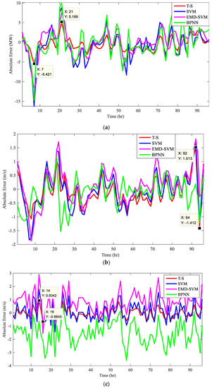 Absolute errors of T–S fuzzy model and other methods in (a) wind power in China; (b) wind speed in China; (c) wind speed in Ireland.