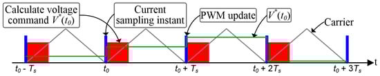 where , , , and are the q- and d-axis voltages and currents, respectively; Lqs and Lds are the q- and d-axis inductance, respectively; rs, ωr, and λm are the phase resistance, rotor electrical speed, and magnet flux, respectively; and s denotes the Laplace operator. When the current loop and PWM function of the PMSM are implemented digitally, a time delay is inevitably introduced. Figure 1 displays the time sequence of the current sampling, voltage command calculation, and voltage command output, where Ts is the sampling period of the motor currents and the control period of the current loop. As depicted in Figure 1, the voltage command is calculated at t0 and outputs to the PWM module at t0 + Ts. Then, the voltage command is activated by the PWM module and held for one sampling period during t0 + Ts to t0 + 2Ts. The motor current induced by the corresponding voltage command is then sampled at t0 + 2Ts. Therefore, a time delay of two sampling periods is generated in the current loop. The PWM function and calculation delay can be modeled together by using a zero-order hold involving one sampling period delay. Accordingly, the stator voltage in Equation (1) can be discretized as follows: