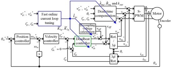 When the current loop is implemented with a digital signal processor (DSP), because of the limited computation capability, the calculated voltage command requires one control period delay for the pulse width modulation (PWM) module to output voltage to the motor. This time delay causes an underdamped or unstable current response when a proportional–integral (PI) controller is used for motor current regulation [,,,]. The discretized PI controller directly designed in the z-domain has been proposed in [,]; however, limited improvement in the current loop bandwidth was achieved and current overshoots were persistent. To eliminate the influences of the time delay, schemes based on the predictive current control [,,,,,,] and deadbeat current control [,,,,,] have been proposed. The predictive current controller generates the optimal voltage vector by minimizing a specific cost function. This voltage vector allows the motor current to reach its reference value as fast as possible with minimum overshoot. Deadbeat current control is well-known for its zero overshoot, zero steady-state error, and minimum rise time characteristics. Consequently, the motor current can reach its reference value with minimum control periods without overshoot. Compared with predictive current control, deadbeat control is simple to implement and requires less computation. However, its performance is parameter-dependent, as reported in [,,]. In particular, inductance is sensitive to the current level. Online controller gain tuning is an effective method to mitigate the effects of parameter variations.
