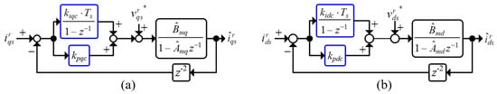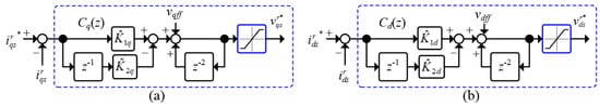 Block diagram of the deadbeat controller with the decoupling voltage and voltage limitation block, (a) Cq(z) and (b) Cd(z).