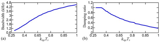 where kiqc and kidc are the integral gains. Figure 5 shows the damping ratio and bandwidth of the current estimator for various kiqc values. The bandwidth of the current estimator is determined from the integral gain, and the proportional gains are then calculated using Equations (8) and (9).