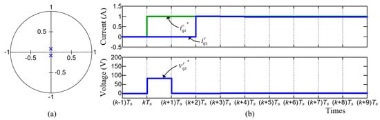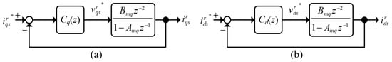 Figure 6 depicts the schematics of the q- and d-axis current control loops with the deadbeat controller, where Cq(z) and Cd(z) are the deadbeat controllers for the q- and d-axes, respectively. Deadbeat controller design is conducted entirely in the z-domain. All the closed-loop poles are placed at the origin in the z-domain. The q-axis transfer function is expressed as follows: