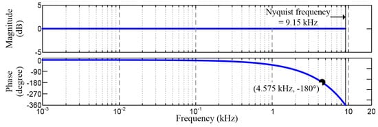 Figure 10 illustrates the frequency response of the deadbeat controller without voltage limitations. The current loop gain is 0 dB at low frequencies and is flat until the Nyquist frequency. This indicates that the current can follow its command without overshoot and steady-state error. However, the phase lag increases with frequency. The phase margin decreases to 0 at 4.575 kHz. Therefore, the maximum theoretical bandwidth of the proposed deadbeat controller is one-fourth of the control frequency.
