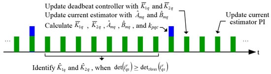 Figure 16 illustrates the timing for identifying and updating the gains in a deadbeat controller and current estimator, where the green bar denotes the execution of the current control and the blue bar denotes the execution of the speed and position control. Because the d-axis current is controlled to 0, only the gains in the q-axis current loop are identified. However, because , the gains in Cd(z) and the d-axis current estimator are set equal to the corresponding q-axis values. The controller gains are identified when the current control loop is executed. Because the current control executes eight times faster than the speed and position control, at most eight controller gains are identified before the next speed control is executed. Then, , , , , , and kpqc are calculated using Equations (8) and (28)–(32) when the speed control is executed. Subsequently, the gains in the deadbeat controller and the parameters in the current estimator are updated in the next execution of the current control because the motor current generally reaches steady state at this instant. The PI controller in the current estimator is updated two control periods after the model gain is updated because the sampled current is two control periods behind the estimated current.