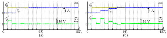 Figure 8 and Figure 9 illustrate the q-axis current, current command, and voltage command when the current steps from 0 to 1 A and from 0 to 4 A, respectively, when the motor is at standstill. As depicted in Figure 8, the q-axis current does not exhibit overshoot and is exactly equal to the command value in two control periods after the current command changes. The voltage command is generated immediately after the current command changes. The voltage commands at the kTs and (k + 1)Ts control periods can be calculated as follows: