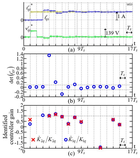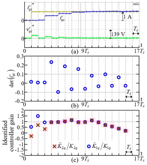 Figure 15b depicts a plot of versus the q-axis current command when Δi is set as 10% of the command value. It can be seen that increases with the current level. Therefore, a threshold for must be set to avoid identification error in the steady state. Accordingly, controller gain identification is performed only when the following condition is satisfied: