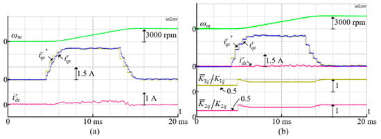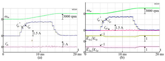 Figure 23a, Figure 24a, and Figure 25a depict the current response with , , and respectively, when online current loop tuning was deactivated. Conversely, Figure 23b, Figure 24b, and Figure 25b display the same waveforms but with online current loop tuning activated. The average controller gains were normalized by their nominal value for a clear observation. Figure 23a indicates that even with the correct inductance, overshoot and undershoot were observed for the q-axis current at high current levels because of the magnetic saturation. By contrast, as indicated in Figure 23b, no apparent overshoot was observed after online current loop tuning was activated.