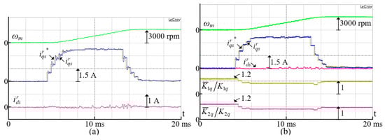 As depicted in Figure 24a, because the estimated inductance was set to half of the nominal value, the q-axis current response became overdamped. In addition, the d-axis current had a marginal steady-state error. By contrast, as illustrated in Figure 24b, the q-axis current was tuned to reach its reference without overshoot within a speed control period and the d-axis current had no steady state error after online current loop tuning was activated. The q-axis current in Figure 25a exhibits considerable overshoot despite the current level because the q-axis inductance is 20% higher than its nominal value. This caused additional ripples to appear on the d-axis current. However, as depicted in Figure 25b, the overshoot was eliminated within a speed control period after online current loop tuning was activated. It can be observed in Figure 24b and Figure 25b that after the deadbeat controller is tuned by the proposed method, the required sampling period for current to reach its command value is reduced from nine to two sampling periods, and the overshoot on the current is reduced from 0.4 A to 0.09 A. These experimental results verify that the proposed method is effective and can greatly reduce the sensitivity of the deadbeat controller to the variations in inductance.