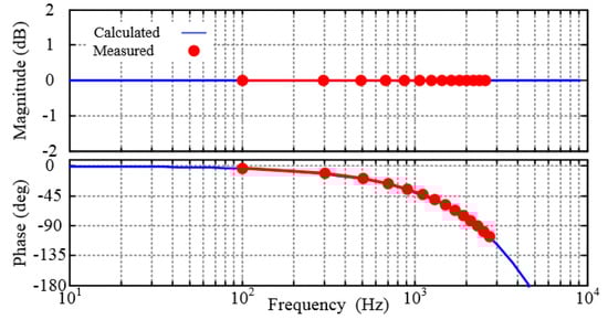 Figure 26 displays the measured and calculated frequency response of the q-axis deadbeat current controller. In the measurements, voltage was within the limit and the motor was at standstill. It can be seen that the current amplitude did not vary with frequency. However, the phase delay gradually increased with frequency. This is because the deadbeat controller was designed to reach its reference in two control periods, and the phase delay for two time periods was small at low frequencies but large at high frequencies.