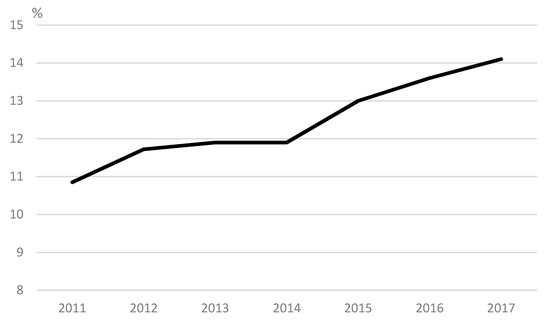 Share of energy from renewable sources in total primary energy in 2011–2017 [65,66,67,68].