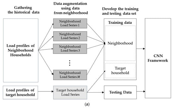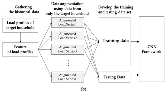 To address the lack of historical data for training, the convolutional neural networks (CNNs) can be an effective method for residential load forecasting, because CNN can capture short-term trends in load data when the local data points are strongly related to each other []. In addition, data augmentation can be one solution to handle the issues. Data augmentation can handle short-duration data collection by enlarging the size of the training data in a way that adds extras copies of training examples in training dataset and minimizes the overfitting in deep-learning techniques []. The overall training cost of a deep network will be reduced when input data are large and contain more similar information. With such enlarged training data, the accuracy of residential load forecasting can be improved. Technical paper [] tries to enlarge the input data using another household’s load series. However, this approach has the potential to obtain data that have different characteristics of the load series of the target household. Moreover, some target households have similar load profiles in their load series, but others do not []. Because of load profile diversity within and between households, existing forecasting benchmarks yield cons rather than pros. In fact, forecasting with only a single household’s data may not often have sufficient information to fit a wide variety of the model capacity, particularly in deep-learning techniques. Therefore, proper data augmentation is required, which can artificially create new training data from the historical data of a single household.