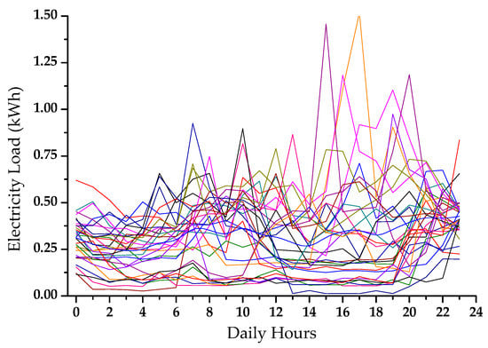 where vector are the hourly load profiles of a target household in day d. Figure 2 shows all daily load profiles of a household for one month. In Figure 2, it can be found that the electrical load of a single household fluctuates abruptly. Generally, a smaller electricity load tends to have a higher variation, which makes it difficult to accurately forecast the residential electricity load. In CNN-based forecasting, one way to achieve high performance is to reduce the variations of training data [].