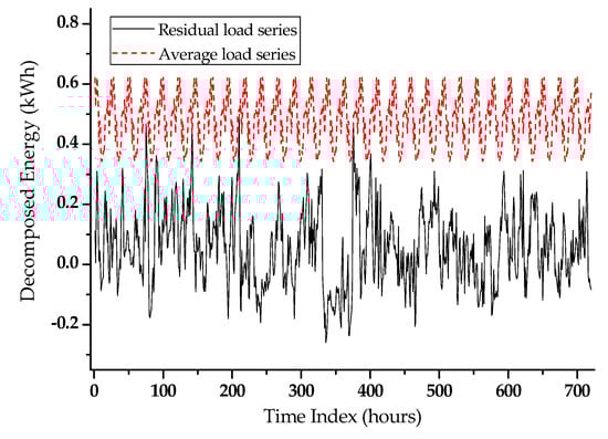 where vector is the centroid load profile (average profile) of the historical load, and is a vector of the residual load series which is the difference between a given centroid and an actual load profile on day . The centroid load profile can be used as the baseline of a particular group of daily load profiles, and the repetition of the centroid load profile yields an average load series for a certain duration. Figure 3 shows an average load series, and its residual load series of a residential household for a month. In Figure 3, the average load series does not contain any uncertain information, but it shows only a regular pattern. On the other hand, the residual load series contains all the uncertain and complex information about the residential load. The residual load series is less volatile than is the original load series but still has inherent characteristics of the residential load. With training from this less volatile data, the CNNs can forecast the small residential load more accurately.