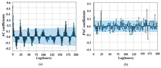 To ensure the appropriateness of the residual load series in learning networks, auto-correlation (AC) or partial auto-correlation (PAC) coefficients [] can be used. Higher AC or PAC coefficients, out of the confidence interval, mean that the present residual load series is strongly coupled with the historical residual load series. Figure 4 shows AC and PAC coefficients of the residual load series of a selected single household with different time lagging. As shown in Figure 4, when the lags are the multiple of 24 h, the AC coefficients would peak, so that some AC coefficients are out of the confidence interval. Similarly, the PAC coefficient spikes also confirm that the residual load series has vital information about the residential electricity load. The information is in a hidden state and can be learned by using learning networks.