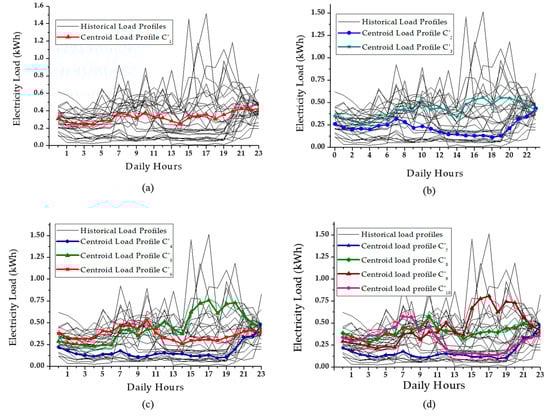 Centroid load profiles generated using multiple k-means clustering algorithm with different clustering number : (a) ; (b) ; (c) , and (d) .