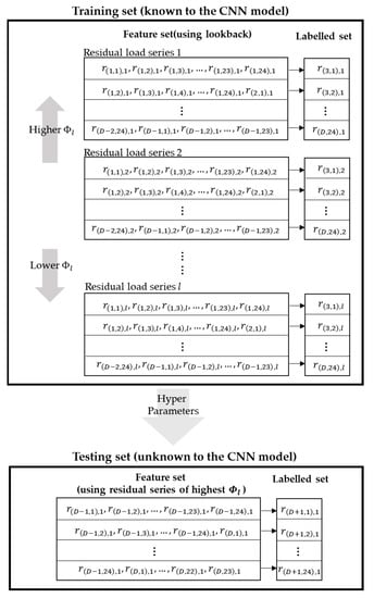 In addition to the training set, the paper used the residual load profiles with the lowest as the test set for the CNN model. Figure 6 shows the structure of training and testing sets of the proposed method. In Figure 6, the residual load profile is expressed with its elements as . In the training set, several time series of residual load series () can be used instead of one original time series () of a single household load. With this enragement of training data, forecasting accuracy for individual residential households can be improved.