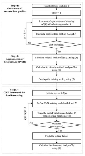 Herein, the paper proposes a load-forecasting method for a single residential household based on convolutional neural networks (CNNs). The CNN is a type of deep neural network where its structure is formed by using convolution and pooling layers [,,]. With the help of various filters, CNNs can learn the inherent information of an electric load series. The proposed forecasting introduces a novel data augmentation technique that concatenates the various residual load series generated from the electrical load of a single household. The original load series is converted to another residual load series containing uncertainty information of electrical load. Several residual load series are extracted through multiple k-means clustering to collect sufficient training data [,]. Among the extracted residual load series, the less uncertain and more homogeneous ones were fed to the CNNs as training data. The proposed augmentation technique can provide enough homogeneous training data to CNNs for more accurate forecasting. The proposed forecasting method was tested on ten single households for a year and is compared with the results of pooling-based augmentation [].