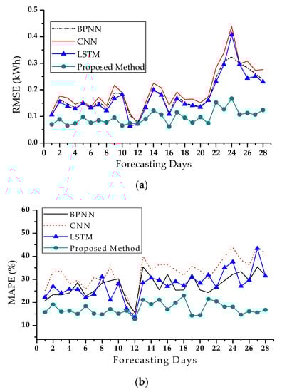 Average mean absolute percentage error (MAPE) and root mean square error (RMSE) of ten arbitrary selected households in July: (a) MAPE result, and (b) RMSE result.