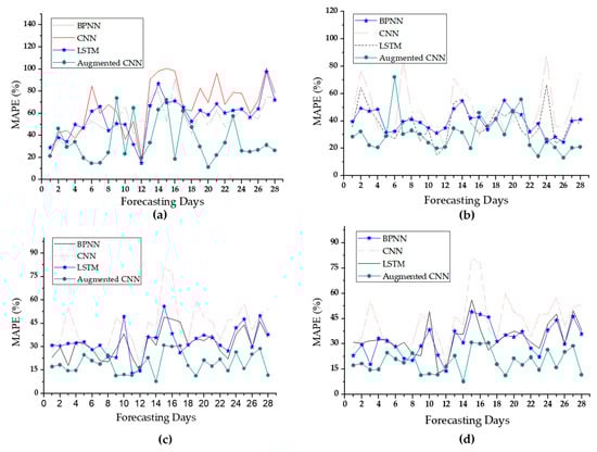 By using the proposed augmentation, the forecasting accuracy was improved by 5 percent, at least, as shown in Table 3. It can be concluded that the proposed forecasting method can significantly improve the forecasting accuracy more than can the other forecasting models without augmentation. When comparing only the cases with the proposed augmentation, the CNN provided more accurate forecasting than the LSTM. It is probably because the augmented data contain plenty of similar random information with small variations. With this information, the CNN received the opportunity for obtaining optimal convergence. On the other hand, as LSTM required more repetitive information for training to improve its performance, this augmented data was comparatively ineffective for LSTM.