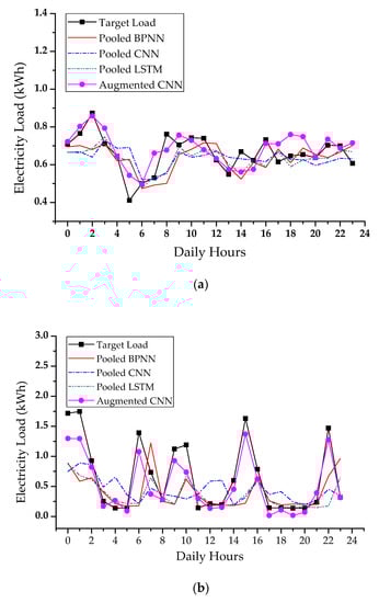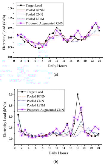 Figure 10a,b show the forecasting results of the peak day for two selected households. One was a less uncertain household which showed the lowest monthly average MAPE in Table 2 (household 4). The other household was a more uncertain household which showed the highest monthly average MAPE in Table 2 (household 10). The peak loads of the two households in July were 1.062 kW (23:00, July 17) and 2.033 kW (18:00, July 14), respectively. During a peak day, it is expected that the residential load profiles will be highly uncertain so that the load forecasting is more challenge. To test the forecasting accuracy, the results of the proposed forecasting method were compared to the results of the forecasting models using pooling augmentation techniques [].