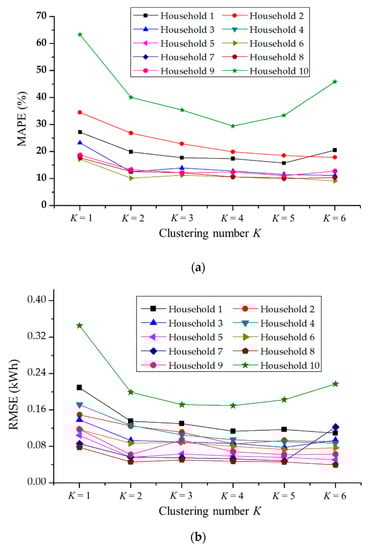 Figure 12a,b show the average MAPE and RMSE results of ten households with different clustering numbers . In Figure 12, very accurate forecasting can be expected when the clustering number is increased for most households. However, for some households, the MAPE is increased when the clustering number is over 4. The higher clustering number provides more training data to the CNNs, so that the CNNs have more chance to learn the load characteristics. However, more training data can increase the variations of the training set, which cause overfitting of the hyper-parameters of CNNs, which degrades the optimal learning of CNNs. Therefore, the optimal clustering number must be selected for each household.