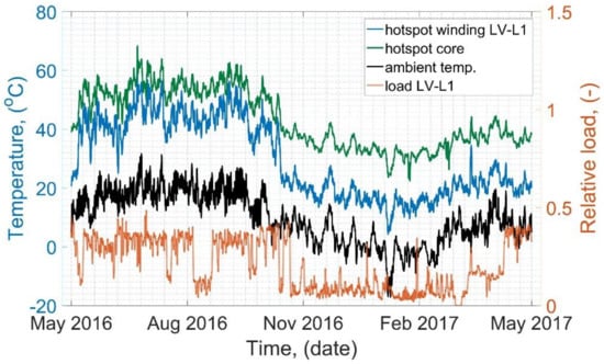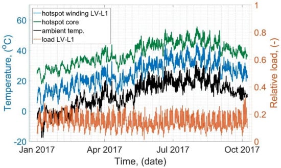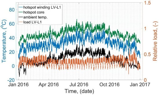All of the selected units were equipped with fiber optic sensors for on-line temperature monitoring: One sensor per HS of each coil and one for core HS (as a result: 10 sensors in 3-winding units and 7 sensors in 2-winding units) and then data were stored within a two-year period (2016–2017) in 1 h steps for further analysis. Additionally, top oil temperature was registered as well as external ambient temperature and the relative load of each phase of the transformers, also in 1 h steps. In Figure 2, Figure 3 and Figure 4 some representative temperature runs that illustrate the dependencies between load, ambient temperature, and HS temperatures in the selected units have been showed. Generally, a quite constant load may be noted regarding all units, with characteristic 24-hour fluctuations. Furthermore, significant, tight relation between HS temperatures and ambient temperature is also observed, more detailed correlation analysis of the HS temperatures of those units has been presented in [].