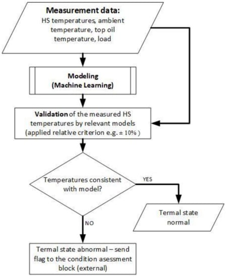 Power transformers are one of the most important electric power devices in the electrical power distribution system. To provide reliable and continuous power delivery, it is crucial to monitor and analyze various parameters, that allow to indicate any abnormalities in operation of each transformer unit, i.e., partial discharges [,,,,], dissolved gas concentrations [,], vibrations [], general insulation condition [,], temperature [,,] and a number of others []. In order to support a continuous rating of transformers, various on-line monitoring systems (OMS) have been willingly implemented so far. Those systems usually cooperate with technical assessment decision support systems (DSS) [,]. Artificial intelligent based algorithms, such as artificial neural networks, fuzzy logic, or machine learning, have been willingly and successfully applied in DSS for the last decade [,,,]. Apart from numerous other indicators, temperature is one of the fundamental parameters that deliver valuable information about potential abnormalities in apparatus operation: Typically, if temperature is higher than expected (or typical) it may be a symptom of some potential faults. Moreover, in the case of transformers, raised temperature is also expected to be a serious threat for the condition of the insulation system, as the aging process of the paper, as well as the oil, is mainly accelerated by the temperature. The degradation rate of the celluloses mainly depends on the temperature and moisture, it is assumed that average temperature rise of transformer by each 6 °C results in doubling its relative aging rate, in other words, its exploitation perspective is shortened twice [,]. There are various state-of-art papers where that issue has been investigated [,,]. The factors that most affect the transformer HS temperature are generally its load and ambient temperature. The currently used diagnostic criteria are based on the acceptable temperature rise of the HS and the top-oil: It is assumed that the average temperature of the windings should not be higher than 65 °C above the ambient temperature, and the HS temperature should not be higher than 78 °C from the ambient temperature, while the temperature of the top-oil should not be more than 60 °C above the ambient temperature [,].