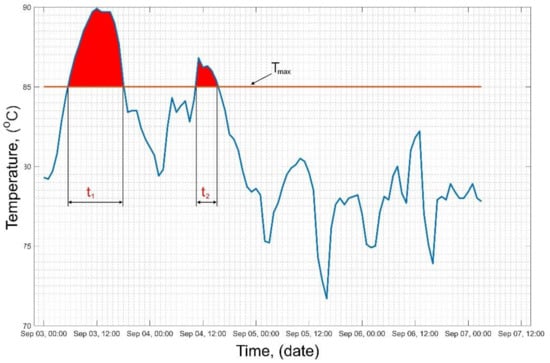 The proposed method does not constrict the conventional thermal rating based on the maximum allowed HS temperature (Tmax), absolute temperature criterion. It is possible and highly recommended to apply them simultaneously. Thus, it is proposed to use the second criterion, the criterion of cumulative minimum time t0 of the impact of Tmax within a selected time interval Δt (Figure 6). Both Tmax and t0 should be specified with particular consideration of the working conditions of the analyzed unit or population of the transformers. In the analyzed case, proposed values are Tmax = 85 °C, t0 = 200 h and Δt = 1 year, chosen on the grounds of the historical data analysis and population load profile and age. The criterion of the minimum cumulative time t0 allows to eliminate the situation in which the thermal state of a given unit would be considered as abnormal when a single, short-term exceeding of the temperature limit Tmax appears. It also allows to store the whole historical data of the exceeded temperatures which may be recalled and analyzed at any time. According to this criterion, an absolute temperature Tmax may also be freely replaced with temperature raise ΔTmax above the ambient, which is more often used according to the current load guides. The only thing that needs to be also adjusted in the algorithm is the allowed temperature raise limit (it should be fitted to the particular fleet on the grounds of the historical data analysis).