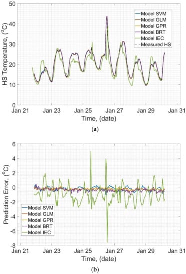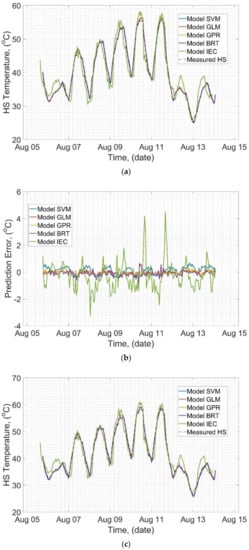 A comparison of quantitative accuracy of all of the applied models is presented in Table 2. Analyzing the results, it is characteristic that winding HS temperatures in the case of ML-based models were predicted with much higher accuracy than regarding the IEC model. MPE of the winding temperature prediction is, in all cases, based on ML not higher than 0.71%, when in the case of IEC, it is 4.8%. Such results may be interpreted as very good, since, e.g., for the average HS temperature of 80 °C, the absolute mean error does not exceed 0.6 °C, regarding the ML models, and 3.8 °C, regarding the IEC model. However, some particular errors of the temporary temperature prediction that may appear within the whole analyzed period should be indicated.