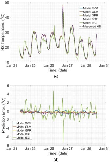 Based on the learning data from 2016, all models were used to predict the HS temperatures in the selected unit in 2017. As results, if presented in the form of the plots for the whole year period, are not legible, only selected one-week periods are presented in this section. In order to provide an adequate assessment of the results, four scenarios are presented: Modeling of the HS temperature of HV and LV winding in the winter season (the lowest ambient temperatures) and in the summer season (the highest ambient temperatures), respectively. Exemplary results of HS modeling in winter season for all of the evaluated models are presented in Figure 7. Relatively good fit may be observed according to all of the applied models. It is characteristic that all of the ML-based models and HS measured curves overlap each other, due to almost perfect fit. In order to better identification of the curves and models, accuracy error plots have been additionally presented (Figure 7b,d). ML-based algorithms yielded almost perfect fit, while in the case of the IEC model, some slight shift may be observed, especially around the local maximums. What is characteristic, a narrow local peak that occurs at the end of 26 January is also reproduced in a relevant way not only by ML models but also by the IEC model. The peak was related to a temporary raise of load, while the unit took load from a twin unit (some maintenance works on the second unit). Relative load in the peak was 0.78, while two hours before and after the load was about 0.35, so the load raised twice. At the very same time, the ambient temperature was almost constant, around –1 °C ± 1 °C. This is an important observation because it confirms that analyzed ML-based models may predict HS temperatures with good accuracy, not only in quite low load conditions but also in case of some temporary high load conditions, which is usually the most complicated scenario for modeling.
