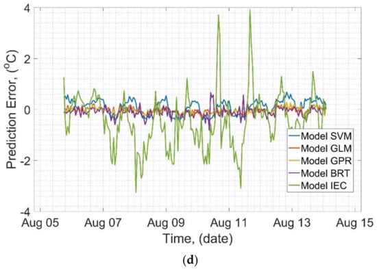 Next, scenarios describing the effectiveness of the applied models are illustrated in Figure 8, where the results of HS prediction in the summer season are presented. All of the models delivered more accurate results than in wintertime (which may be easily traced in error plots), and again, it is only the IEC model that some significant imperfections of fit are related to.