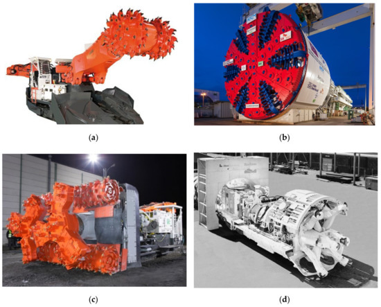 View of (a) roadheader type MR 520 made by Sandvik (b) tunnel boring machine (TBM) – Mixshield S-762 for full face mining made by Herrenknecht, (c) multi-organ crawler-mounted borer miner type MF 420 made by Sandvik, (d) the mobile tunnel miner (MTM) for hard rock tunneling by Aker-Wirth [3,4,5,6].